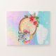 puzzle with white clouds elephant with crown sitting next to a log with pink flowers