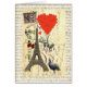 Amusant animal d'éléphant vintage, mignon et romantique, avec ballons rouges en forme de coeur de Saint-Valentin, avec la tour Eiffel. Paris, France sur un design de carte postale rétro antique, avec paon et papillon. Visitez le MAGASIN VINTAGEPRINTS pour une illustration vintage plus amusante, des cadeaux de jour valentins romantiques.