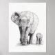 A pencil drawing of a mother elephant and her baby walking toward you.