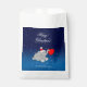Cute elephant with red hat and bag with Christmas gifts over blue background with white snowflakes