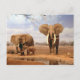 Animal card showing africant elephant family at a water hole in the desert. The African bush elephant (Loxodonta africana) is the larger of the two species of African elephant. African bush elephants are the largest living terrestrial animals.