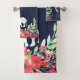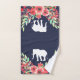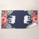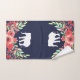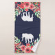 Fleurs d'aquarelle rose tendance et feuillage vert avec silhouettes d'éléphant blanc sur serviettes de bain bleu marine.