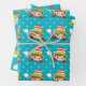 A trio of gift wrap, each with a different design on is ideal for your presents on Christmas day. The first sheet has the face of an elf girl with brown hair wearing a cute elf hat with a white pompon; the second has elf feet and stockings on blue and the third a face of a cute cartoon elf boy wearing a striped hat set against a blue background filled with polka dots in red white and yellow. These fun and modern present wrap patterns are ideal for your family; friends and work colleagues on Christmas day.