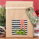 Elf legs in striped tights and green boots on black and white stripes and gold dots includes your personal greeting on these Christmas square stickers. MATCHING items in our store.