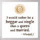 "I would rather be a beggar and single than a queen and married." Queen Elizabeth said this to the Ambassador of the Duke of Wurtemberg in 1564.