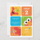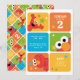 This bright and playful design features Elmo in a bold color-block layout made up of rounded squares in orange, blue, green, and yellow. Each section highlights fun Elmo expressions, cheerful stars, and energetic Sesame Street–style graphics that create a lively and engaging look for a kids birthday celebration. The layout is designed to showcase personalized party details such as the child’s name, age, date, time, location, and RSVP information, all presented in a clean and easy-to-read format. The vibrant colors and friendly Elmo artwork make this design perfect for a fun-filled toddler or young child birthday theme.