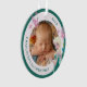 This is a precious, rounded Christmas ornament, perfect for commemorating a baby's milestone first holiday season. The design is charmingly accented with Disney's Elsa from Frozen, along with sparkling snowflakes and frost detailing. The border is inscribed with personalized text celebrating the baby's 1st Christmas and the specific year. This stunning piece is a delightful, lasting keepsake to mark a baby's first magical holiday!