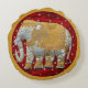 Image of an Indian Elephant decorated with sequins and beads in white, silver, and gold against maroon red velvet.