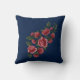 Embroidered Red Roses Green Leaves Floral Blue Throw Pillow