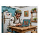 The character is hunched over a rugged, embroidered laptop on a wooden kitchen table, with embroidered fingers poised over the keyboard. The laptop screen displays vibrant, abstract patterns—energetic swirls, chaotic stitched visual data, and metallic thread accents—evoking a splash of color and motion without any text. The scene is set in a cozy, slightly retro kitchen, with embroidered teal or pale blue wooden cabinets, a vintage-style refrigerator, and a simple wooden table and stools, with wood grain suggested through directional stitches like stem and split stitch. A window with embroidered frame allows soft light to filter in, while potted herbs with embroidered leaves in various green tones add lively detail.
