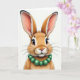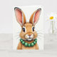 This card features a close-up portrait of an anthropomorphic long-eared rabbit 🐰 set against a plain white background, with the head and upper torso filling most of the space. Its fur shifts through warm caramel and ginger shades, shaded to look soft to the touch, as if you could lean in and feel the cozy texture. The long ears rise high with a soft pink inner tint and slightly darker tips, adding a tender, affectionate look to its pose. Large amber-brown eyes with long lashes meet the viewer with a gentle, friendly gaze, like it’s sharing a quiet moment with someone close 🐇. A small rosy nose and a slight upturned mouth give it the look of a shy smile meant for a friend. A glossy strand of emerald-green round beads sits at the neck, standing out sharply against the warm fur. There is no text on the front, leaving the white space open around the rabbit’s face, with fine whiskers fanning outward in thin, pale lines.