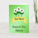This card features a bright green gradient background that shifts from light lime at the top into deeper emerald below, setting a cheerful scene. Three stylized flowers stand tall in the center with white petals around dark brown centers, their slim dark-green stems and simple leaves leaning close together like a small family huddle ❤️. A wide yellow banner stretches across the middle with folded ends and pointed tails, creating a spotlight for the main message. On that banner, the words “Best Mom!” are placed front and center in green lettering that matches the leafy tones behind it. Below the banner, “Award For Niece” sits as a smaller line in plain black letters, aligned neatly under the main phrase. The mix of a mom-focused headline with that unexpected second line adds a wink of family closeness, like an inside joke shared with a smile 🌼. The flowers appear to peek from behind the banner, with their petals overlapping slightly and the yellow ribbon cutting across the stems.