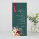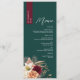 Add rich autumn elegance to your wedding tablescape with this personalized jewel-tone wedding menu. Featuring a deep emerald green background and a dramatic burgundy name strip, this rustic floral design showcases romantic blush, ivory, and wine-coloured blooms with dried grasses—perfect for fall or winter celebrations. Elegant fonts and a clean layout give it a timeless yet modern feel. Customize the meal details and guest name for a beautiful place card alternative at your reception.