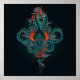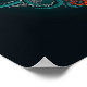 A powerful, teal-coloured dragon coiled into a circular formation against a dark background. The dragon's head is fierce, with glowing red eyes and sharp teeth. Flames emanate from its mouth and body, and it is surrounded by swirling clouds. The dragon's body is adorned with scales and spikes, and its tail curls around to complete the circular shape.