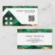 This modern business card features a rich emerald green marble design with luxurious gold rock texture accents on a clean white background. The layout includes a bold geometric house shape, making it perfect for real estate professionals.