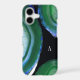 Elegant and eyecatching phone case features a vibrant image of agate geode slices in bright shades of emerald green with blue accents on a black background. Personalize with your initials or monogram tucked into the design in classic white lettering.