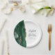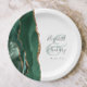 These elegant modern wedding plates feature an emerald green watercolor design trimmed with faux gold glitter. Easily customize the green text on a white background, with the names of the bride and groom in handwriting calligraphy over a large ampersand.