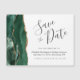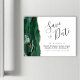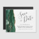 This elegant save the date magnetic card features an emerald green watercolor agate border trimmed with faux gold glitter. The customizable text combines charcoal grey handwriting script, copperplate and italic fonts on a white background.