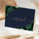 This elegant, modern wedding table reserved seating place card features an emerald green watercolor agate image trimmed with gold faux glitter in opposite corners. The word "reserved" appears in gold-coloured handwriting script with swashes before and after on a navy blue background on both sides of the card.
