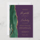 The left-hand edge of this elegant modern wedding invitation features an emerald green watercolor agate border trimmed with faux gold glitter. The customizable text combines gold-coloured handwriting, copperplate and italic fonts on a deep purple background. Add your favourite photo to the reverse side, along with additional text and a QR code to send guests to your wedding website.