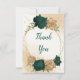 Beautiful wedding thank you card featuring emerald green and beige gold flowers with green leaves .