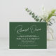 This simple wedding Rehearsal Dinner invitation features elegant script text on a dark emerald green background.