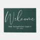 An elegant emerald green doormat featuring beautiful script calligraphy welcome and personalized with your family name and special date. Designed by Thisisnotme©