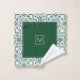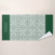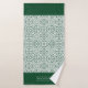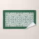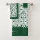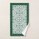 Emerald green and white damask pattern and scalloped borders Bath Towel Set. The bath towel features an elegant green and white damask pattern and bands on the short sides with scalloped edges. There is also a frame with your family name. The hand towel showcases a scalloped border around it while the wash cloth is in green colour in the centre with a damask border and your monogram. You can personalize it with your family name and monogram.