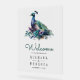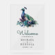 Amaze your guests with this elegant wedding welcome sign featuring a beautiful peacock and elegant feathers.