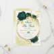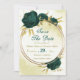 Beautiful wedding save the date card featuring emerald green flowers and gold leaves.