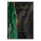 The left-hand edge of this elegant modern wedding table number card features an emerald green watercolor agate border trimmed with faux gold glitter. The word "table" appears in gold-coloured handwriting script on a black watercolor background. Add the names of your guests who are assigned to each table.