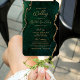 This elegant, modern wedding program fan features an emerald green agate background trimmed with gold faux glitter. The text appears in gold-coloured handwriting and copperplate fonts.