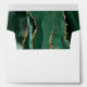 The inside of this elegant modern wedding invitation envelope features an emerald green watercolor agate design trimmed with faux gold glitter. Customize the back flap with the names of the bride and groom in charcoal grey handwriting script and return address in copperplate font on a white background.