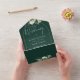 All in one emerald green wedding invitation featuring botanical greenery rustic leaves falling across a gold arch enclosing elegant typography. The invitation includes a perforated RSVP card with your wedding website QR code. Designed by Thisisnotme©