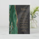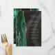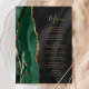 Le bord gauche de cet élégant menu mariage moderne comporte une bordure d'aquarelle vert émeraude bordée d'une parties scintillant en faux or. Le texte personnalisable combine un script d'écriture fantaisiste couleur or et des polices de cuivre sur un arrière - plan d'aquarelle noir. L'envers est assorti d'une agate vert émeraude et or.