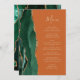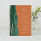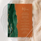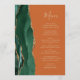 The left-hand edge of this elegant modern wedding menu features an emerald green watercolor agate border trimmed with faux gold glitter. The customizable text combines gold-coloured whimsical handwriting script and copperplate fonts on a burnt orange background. The reverse side features a matching emerald green and gold agate design.
