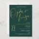 Create elegant business real estate event invites for your house warming or new business party with this green and gold Open House Invitation. This professional emerald green and faux gold open house event invitation features a minimal layout with calligraphy script font and space for your logo and event details, perfect to invite guests to your Housewarming Celebration or Open Day Event.