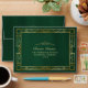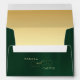 Elegant emerald green wedding envelope features a beautiful decorative gold frame with an elegant gold script and fancy embellishment design.