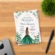 The invitation features an elegant, nature-inspired design with a watercolor frame of greenery and floral accents in green and gold. At its centre is an illustration of a young woman in an emerald-green gown with flowing hair adorned by a golden crown. The text is styled in a mix of cursive and serif fonts, with gold embellishments like a crown adding a regal touch. The layout is balanced, combining sophistication with a graceful, formal aesthetic.