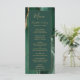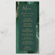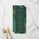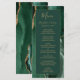 This elegant modern wedding menu features an emerald green watercolor agate frame. The customizable text combines gold-colored whimsical handwriting script with italic and copperplate fonts on a green background. The reverse side features a matching emerald green and gold agate design.