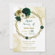 Beautiful emerald green ivory white and gold flowers with gold leaves on a gold circle wreath bridal shower invitation.