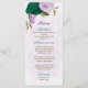 Beautiful romantic wedding menu card featuring emerald green and purple flowers and some leaves .