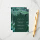 This design features an emerald green arch on a background of green watercolor agate strata sprinkled with silver faux glitter. The word "details" appears in elegant white calligraphy script. Add your wedding information in white italics. The back of the card repeats the green and silver background design.