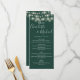 Elegant emerald green wedding menu card featuring pretty string lights and signature style names. This modern menu card can be personalized with your information in chic white lettering. Designed by Thisisnotme©
