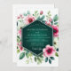 This design features an emerald green background surrounded by a lush wreath of romantic pink and white blooms. Delicate blush roses and anemones are nestled among soft sage eucalyptus and greenery. The sophisticated palette creates a moody yet elegant atmosphere for botanical themed events. This artistic watercolor style brings a touch of timeless charm.