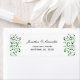 Cette étiquette d'adresse de retour présente une vigne verte émeraude simple à chaque extrémité du étiquette. Au milieu, le texte personnalisé vous permet d'ajouter votre nom et votre adresse de retour. Cet étiquette se coordonne avec un faire-part de mariage trouvé dans cette boutique... Laurel Lane Paperie.