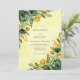 This watercolor design features lush emerald green roses paired with sunny yellow ranunculus blossoms. Verdant foliage and delicate leaves surround the edges, set against a soft pale yellow watercolor background. The vibrant color palette creates a cheerful and sophisticated mood for a seasonal marriage.
