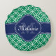 Emerald Green Wht Moroccan Pattern Navy Monogram Round Pillow