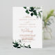 This emerald greenery rose gold foil wedding invitation card is perfect for a boho wedding. The elegant yet rustic design features moody dark green watercolor leaves and eucalyptus with a modern bohemian woodland feel. Featuring luxurious rose gold foil text.