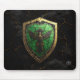 Majestic mouse pad with a golden eagle set against a glowing emerald green crystal shield. Features ornate filigree and realistic cracked textures on a premium golden veins textured marble black surface. Designed for fantasy lovers and nature-themed gaming desk setups.